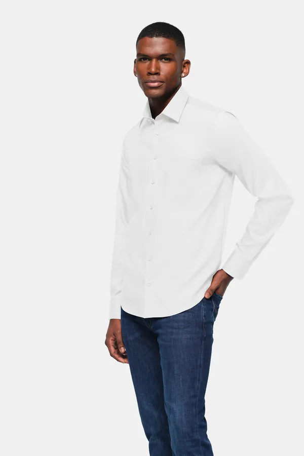 Klassisches Hemd mit Kent-Kragen und aufgesetzter Brusttasche. Knöpfe Ton in Ton (Farbe Himmelblau: Knöpfe in Farbe Weiß), Paspel aus dunkelblauem Satin an der inneren Kragennaht, eingearbeitete Kragenstäbchen, doppelte Schulterpasse, weitenverstellbare Manschetten und leicht gerundeter Saum. Formstabiler, strapazierfähiger und bügelfreier Baumwoll-Popeline. Verfügbar auch als Damenmodell. Lockere Passform: Comfort Fit.