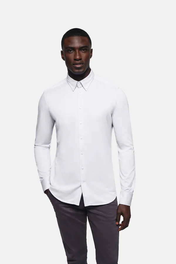 Modisches Hemd mit Button-down-Kragen. Leicht tailliert durch Abnäher im Rückenteil. Knöpfe Ton in Ton (Farbe Ozeanblau: Knöpfe in Farbe Weiß), Paspel aus dunkelblauem Satin an der inneren Kragennaht, doppelte Schulterpasse, Doppelkappnaht an den Seitennähten, weitenverstellbare Manschetten und leicht gerundeter Saum. Bügelleichte Jaquard-Maschenware aus strapazierfähiger Baumwoll-Polyester-Mischung. Tragekomfort und Elastizität durch die spezielle Stricktechnik. Verfügbar auch als Damenmodell. Normale Passform: Regular Fit.
